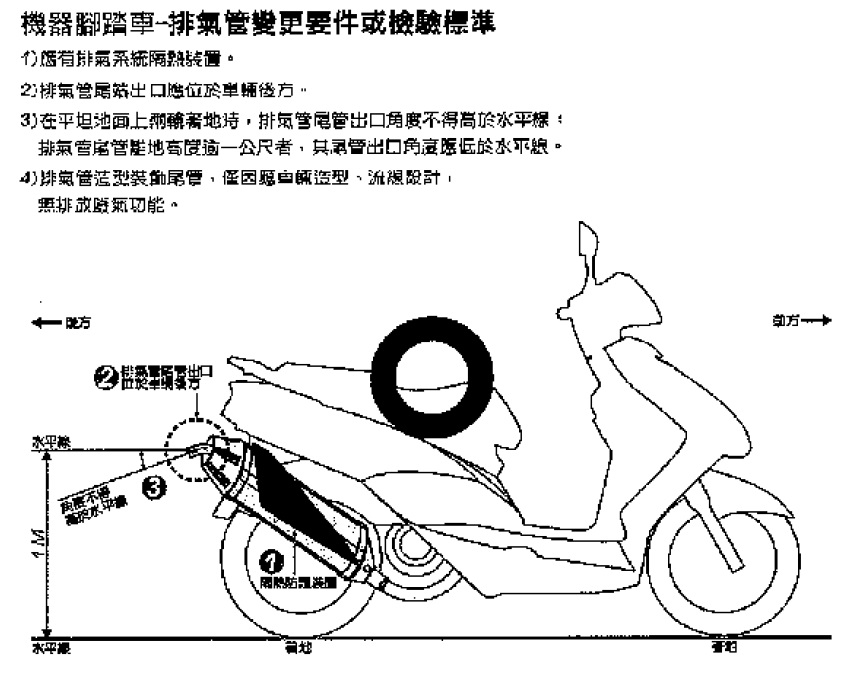 | 車身 | 車身外殼 | 原機器腳踏車製造廠或機器腳踏車代理商宣告該車型外殼已停產者,可更換同廠牌同型式系列外殼。 | 自中華民國九十六年一月一日起列為臨時檢驗項目。 |