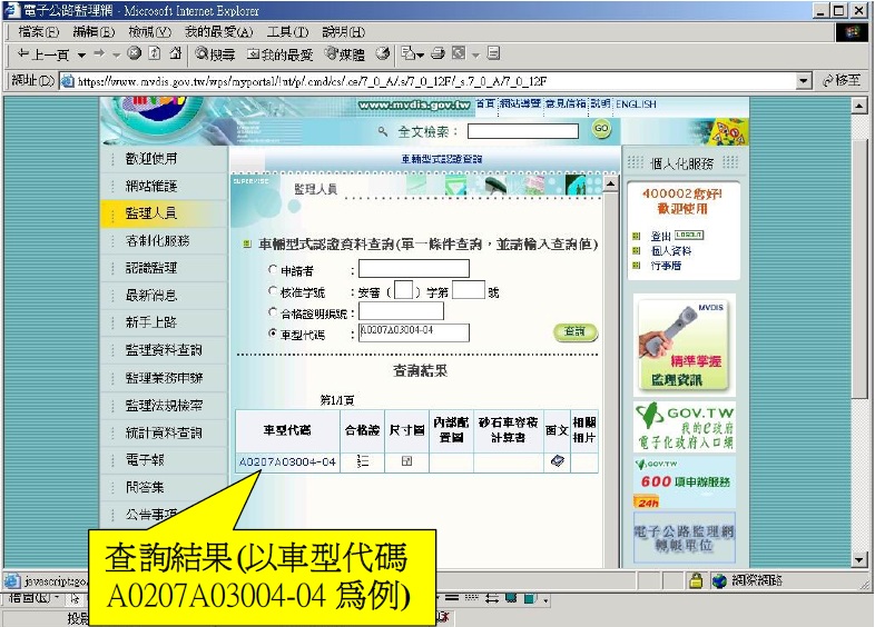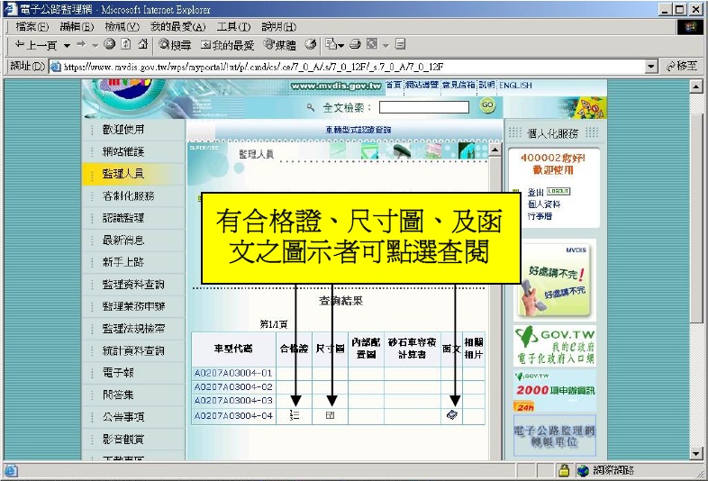 登入後可修改個人資料,查詢型式認證資料直接點選監理人員。